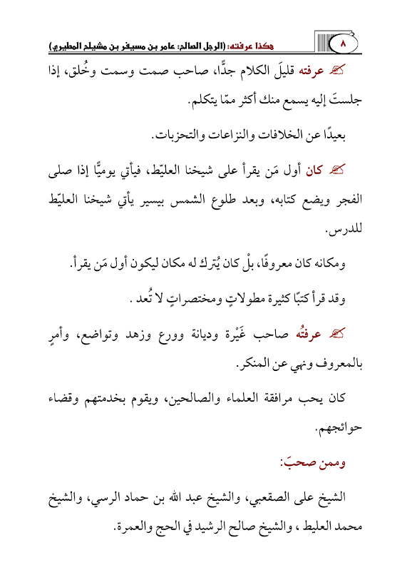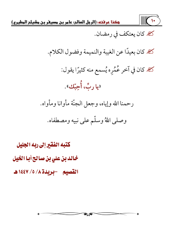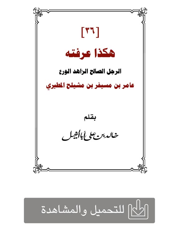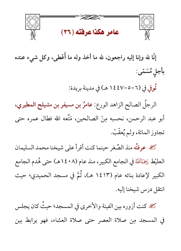 (23) هكذا عرفته: بسم الله الرحمن الرحيم ( صالح بن عبدالكريم المالك رحمه الله) إنـــــــــــــــا لله وإنـــــــــــــــــــــــــا إليــــــــــــــــــه راجعــــــــــــــــون في هـــــــــــذا اليـــــوم يــــوم الجمعـــــــــة الموافق 1444/8/18هـ توفي في بريدة الشيخ صالح بن عبدالكريم المالك رحمه الله وغفر له بعد معاناة من المرض جعله ...